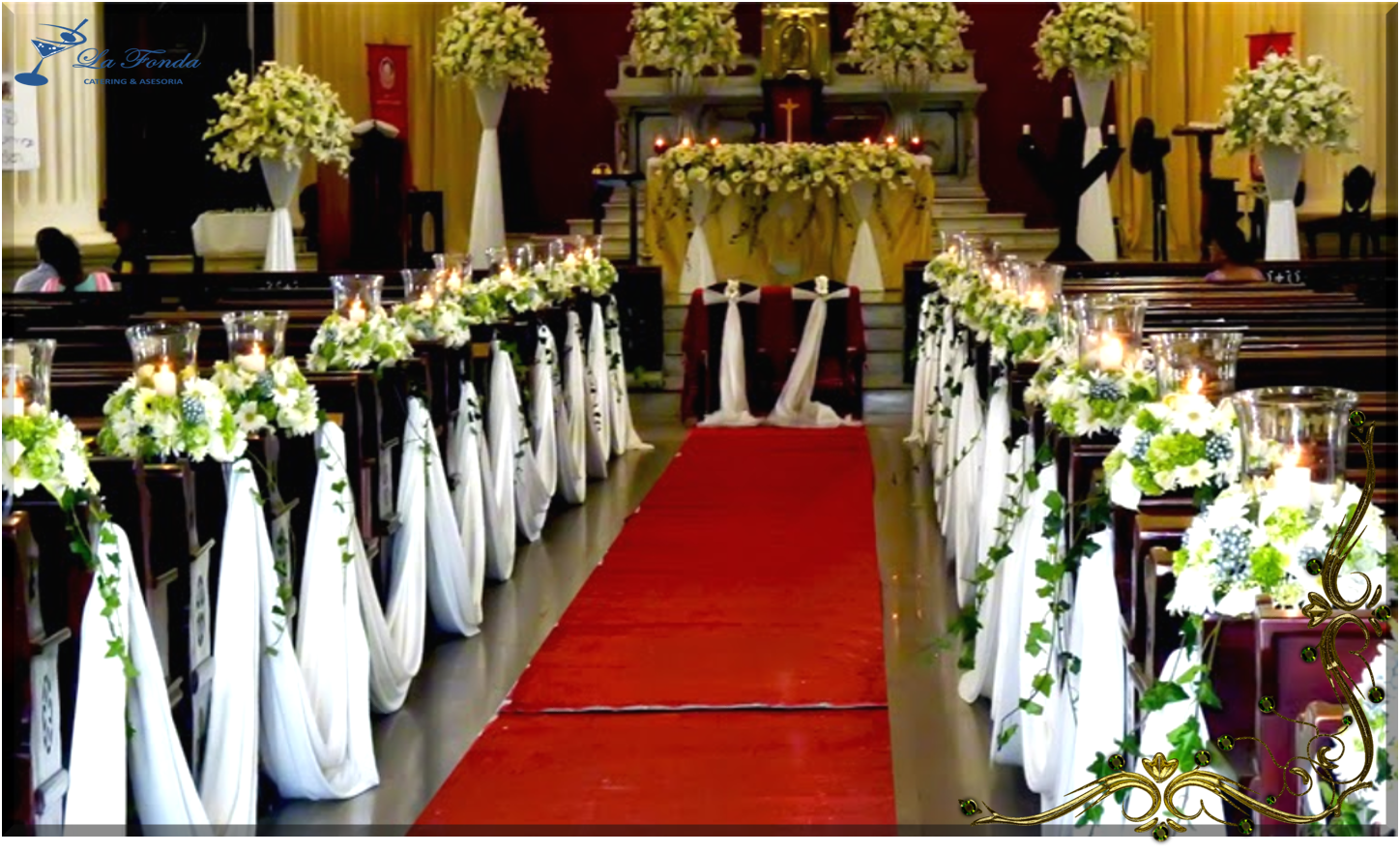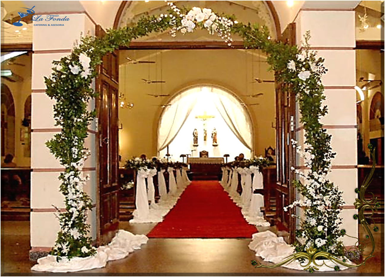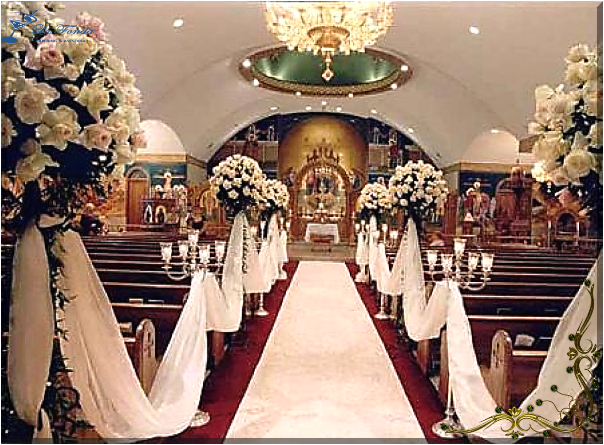 Ingreso a altar Bizantino, decorado con arreglos florales, seda o raso con alfombra blanca
