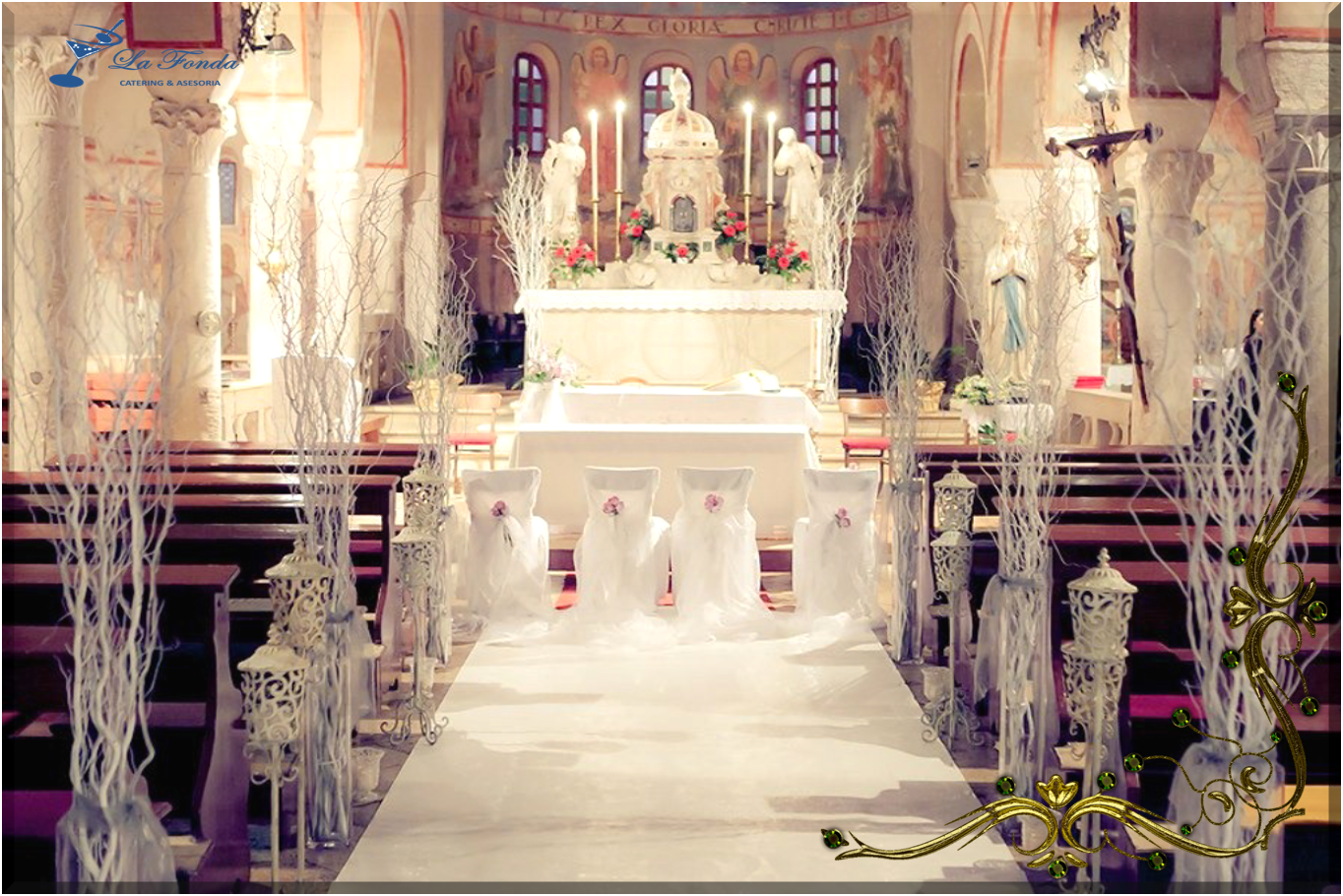 Decorado de ingreso a Altar, alumbrado con lámparas blancas, acompañado de ramas blancas y frente al altar sillas para los novios y padrinos enfundados con seda y tul sujetos por prendedor de flores naturales
